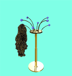 The base and frame of the D&D Ponytail Holder are made of polypropylene by injection molding. The base is circular in shape and has an approximate ten-inch (10) diameter. The hairpiece-supporting frame is a telescoping cylinder of two-inch (2) diameter; its shortest, compact length is twenty-four inches (24), and its fullest length when fully extended is forty-four inches (44). |